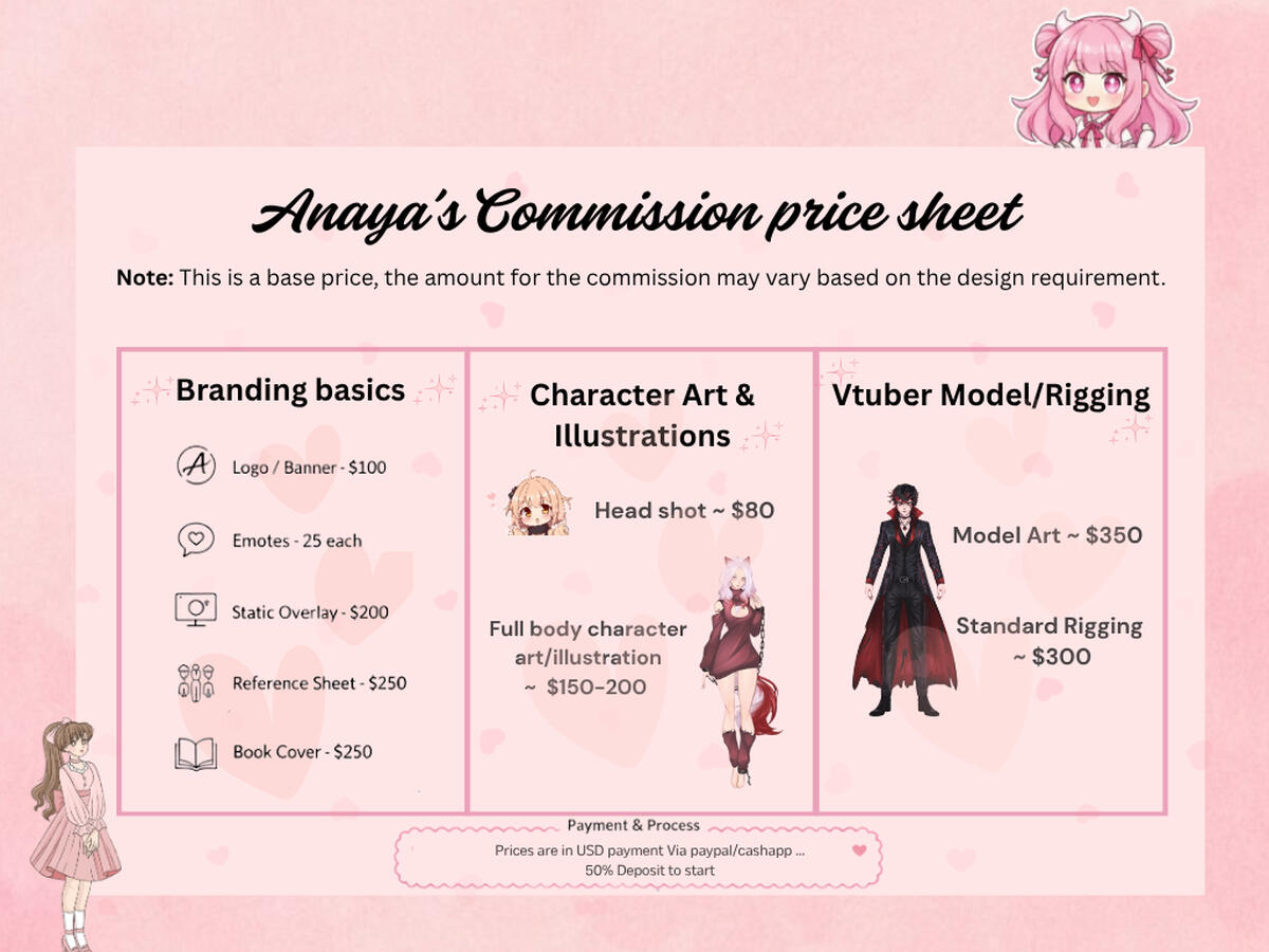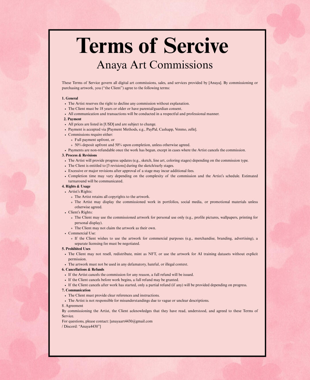 Hi guys my name is Anaya Welcome to my carrd. I'm a commission based artist and an illustrator. I'm also 25 y/o. I've always had a passion for digital art and love working with Vtubers, authors, furries, and generally anyone who appreciates art ^ . ^You can always find me on my socials feel free to reach out <3My Discord = "Anaya4430"